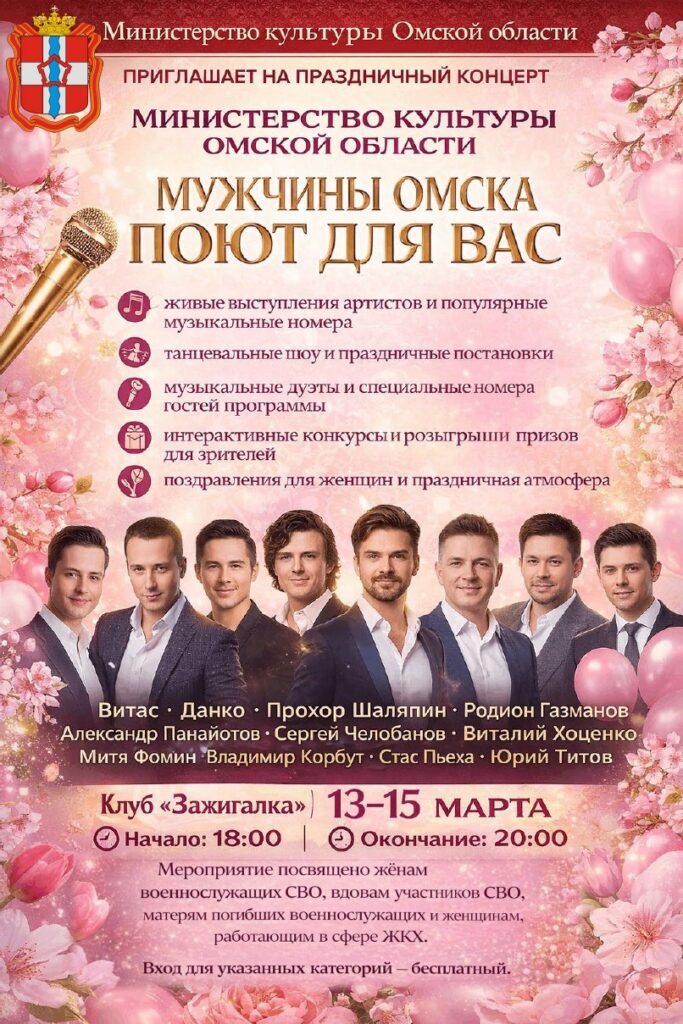 Министерство культуры Омской области приглашает на праздничную концертную программу, которая пройдет 13–15 марта в клубе «Зажигалка».